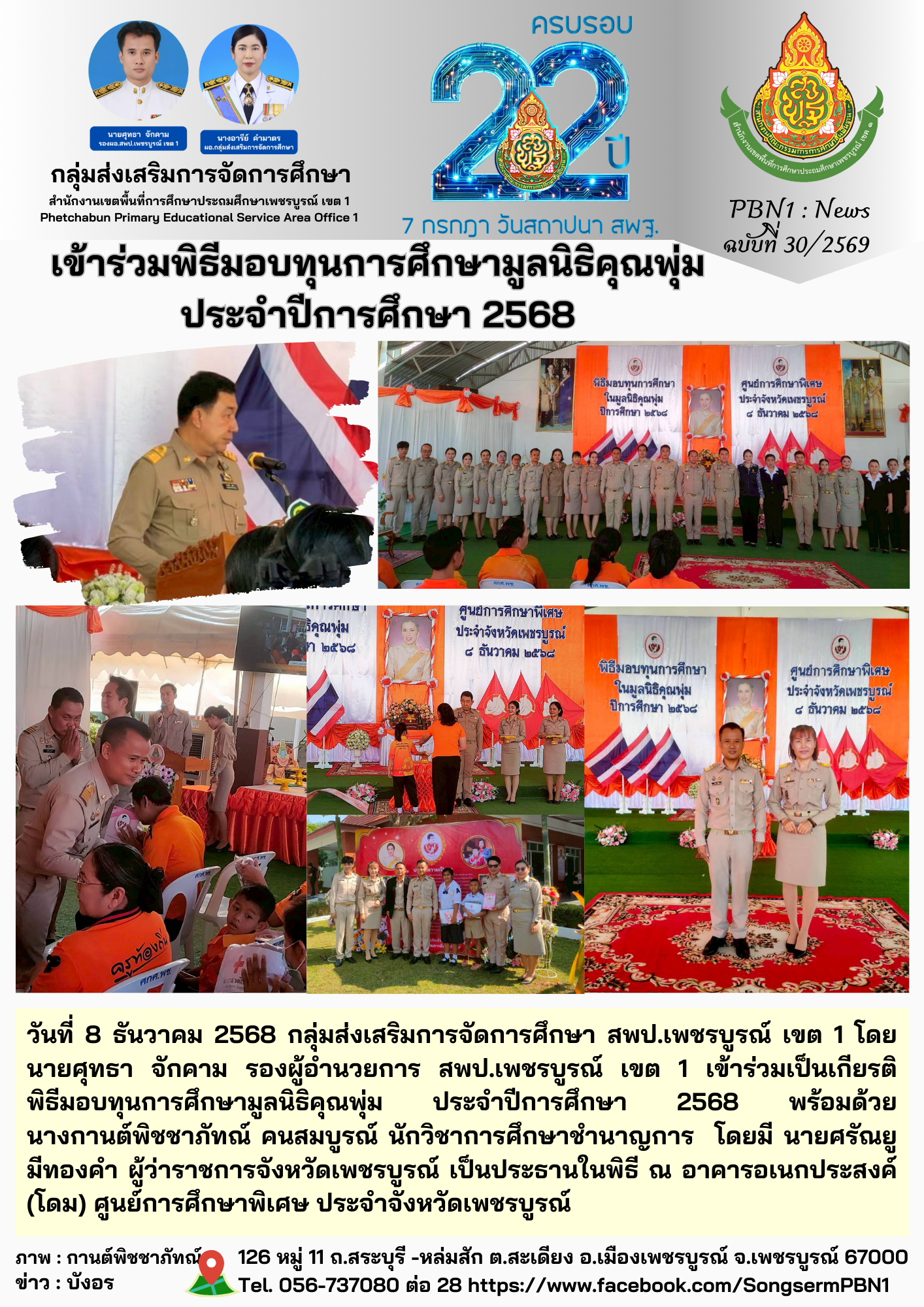 วันที่ 8 ธันวาคม 2568 กลุ่มส่งเสริมการจัดการศึกษา สพป.เพชรบูรณ์ เขต 1 โดย นายศุทธา จักคาม รองผู้อำนวยการ สพป.เพชรบูรณ์ เขต 1 เข้าร่วมเป็นเกียรติพิธีมอบทุนการศึกษามูลนิธิคุณพุ่ม ประจำปีการศึกษา 2568 พร้อมด้วยนางกานต์พิชชาภัทณ์ คนสมบูรณ์ นักวิชาการศึกษาชำนาญการ โดยมี นายศรัณยู มีทองคำ ผู้ว่าราชการจังหวัดเพชรบูรณ์ เป็นประธานในพิธี ณ อาคารอเนกประสงค์ (โดม) ศูนย์การศึกษาพิเศษ ประจำจังหวัดเพชรบูรณ์